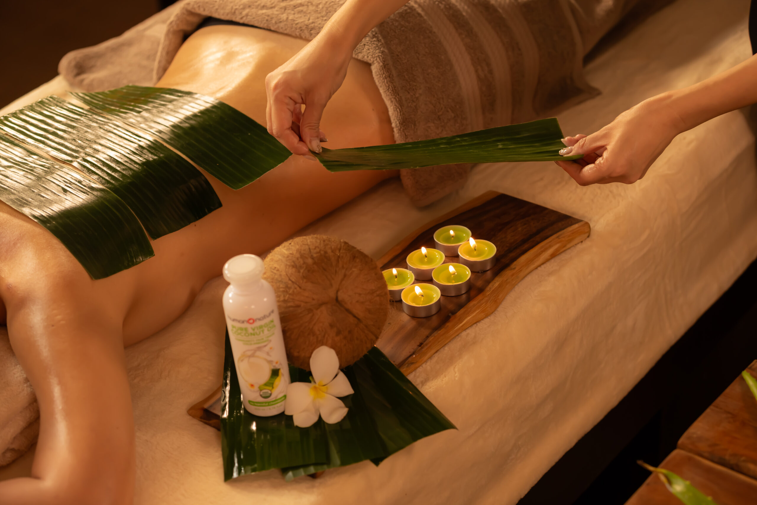スクラブ後は、バナナの葉で丁寧に保湿し、肌本来のうるおいと透明感を引き出します。